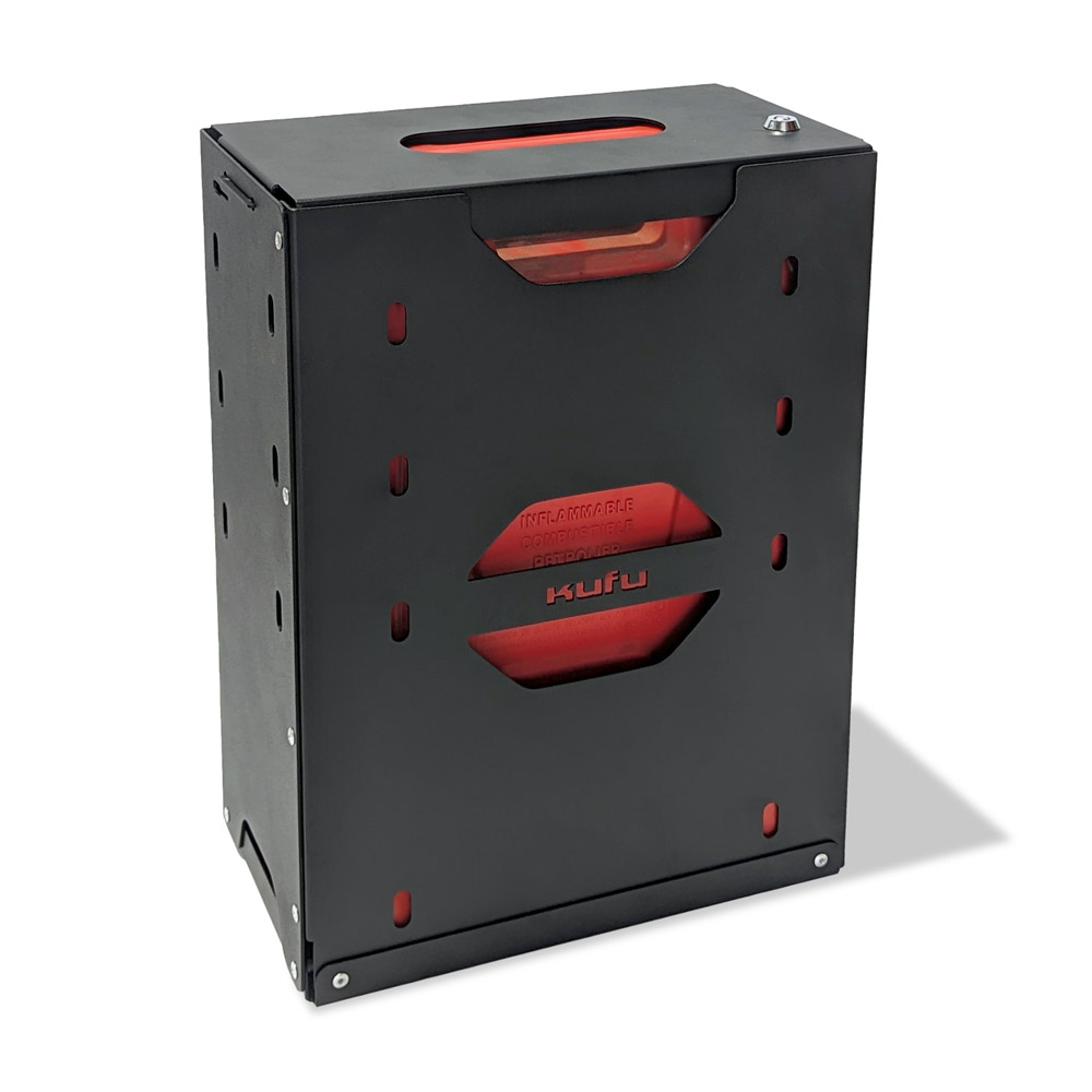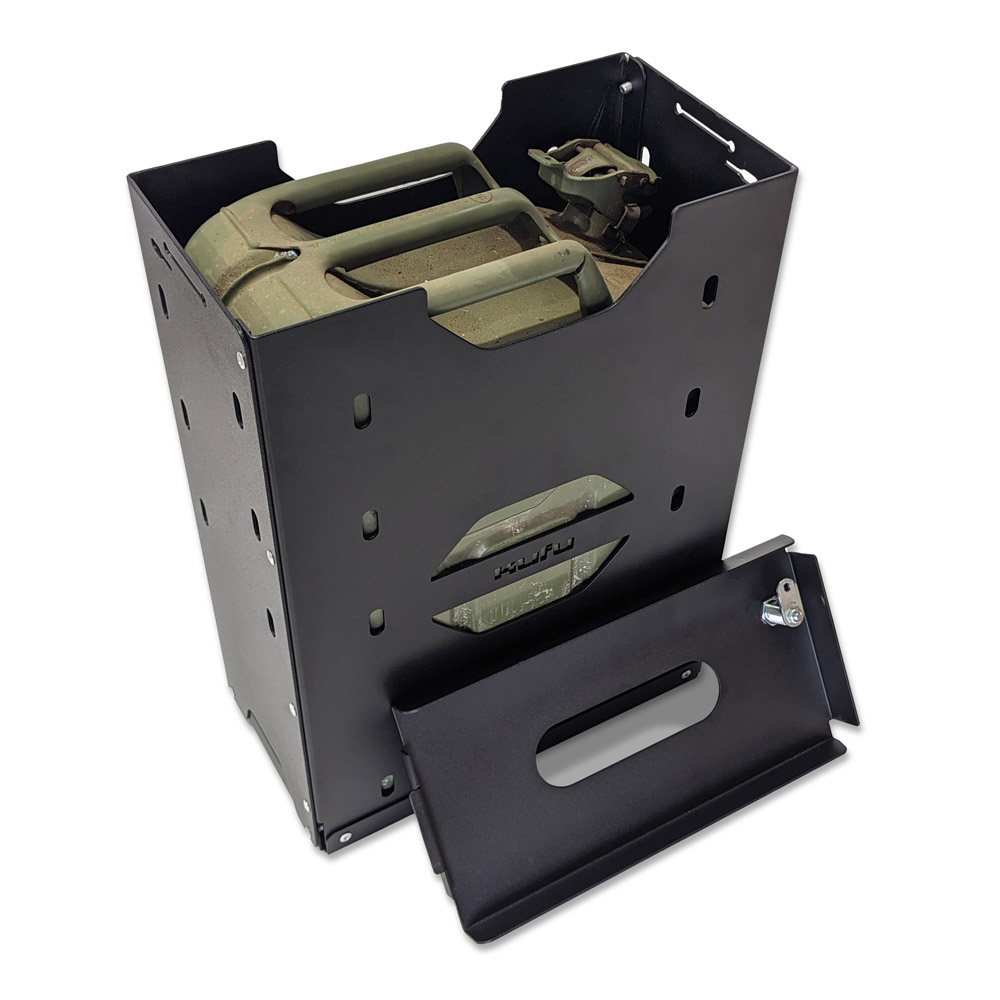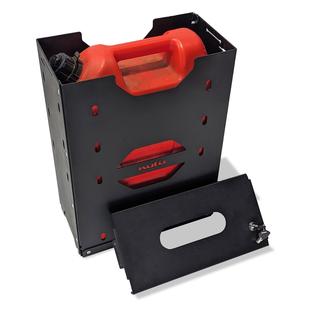 The KUFU Jerry Can holder fits most readily available 20L jerry cans,  including steel and poly versions.