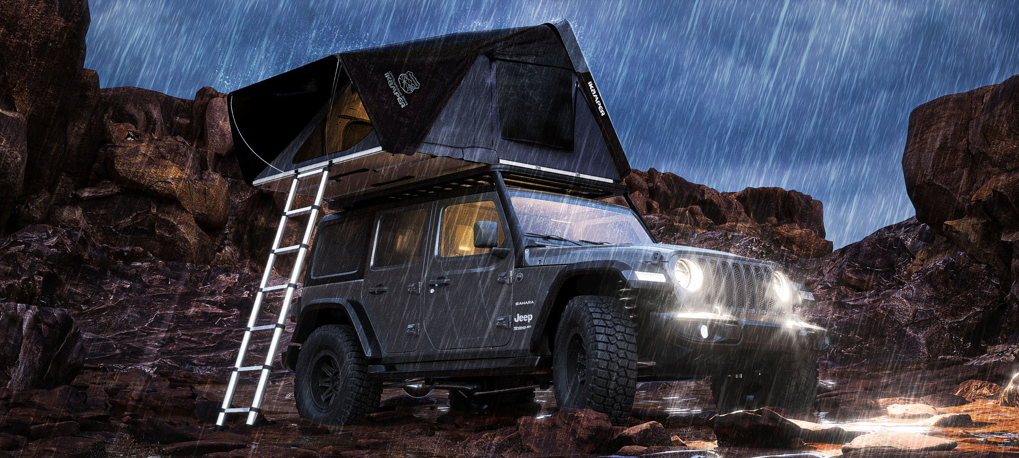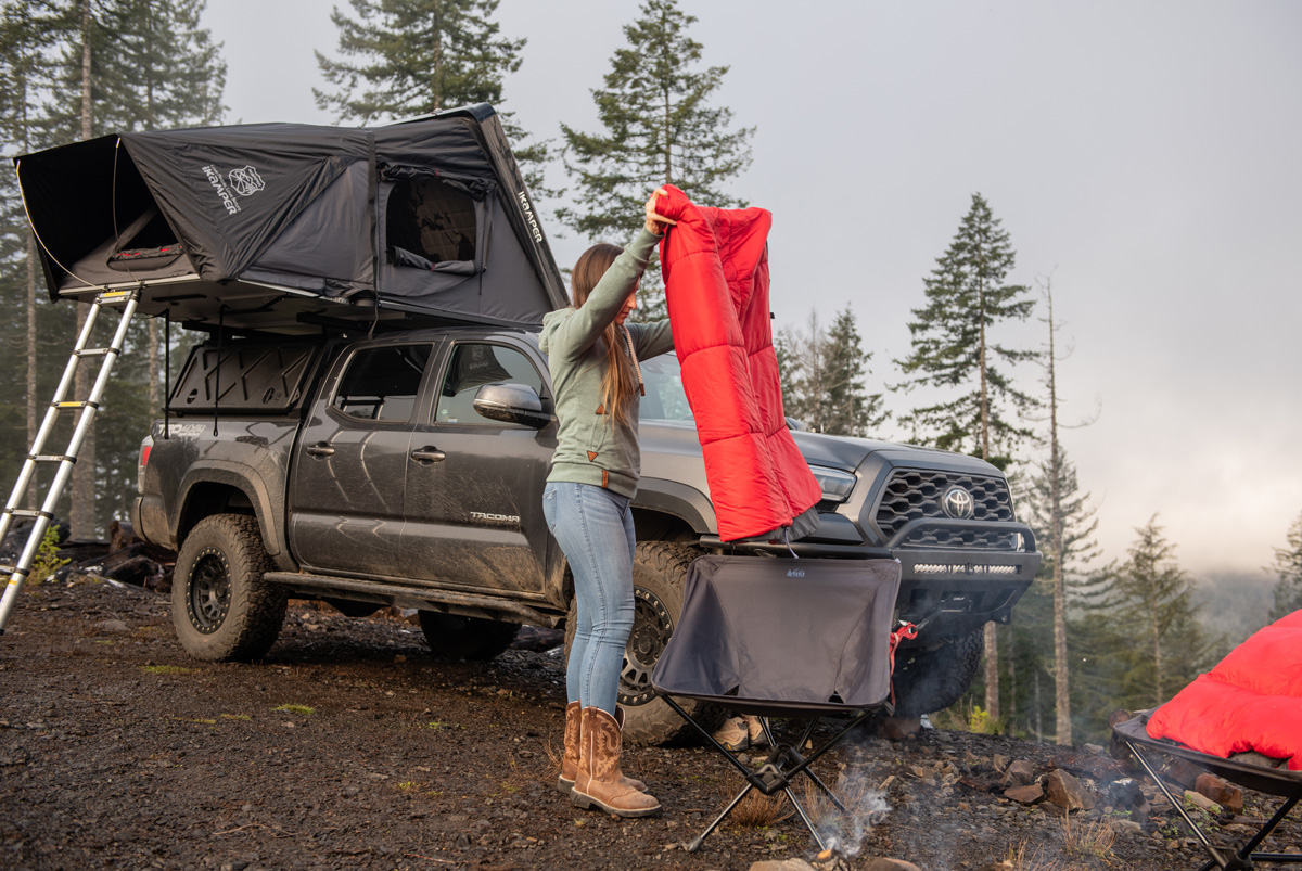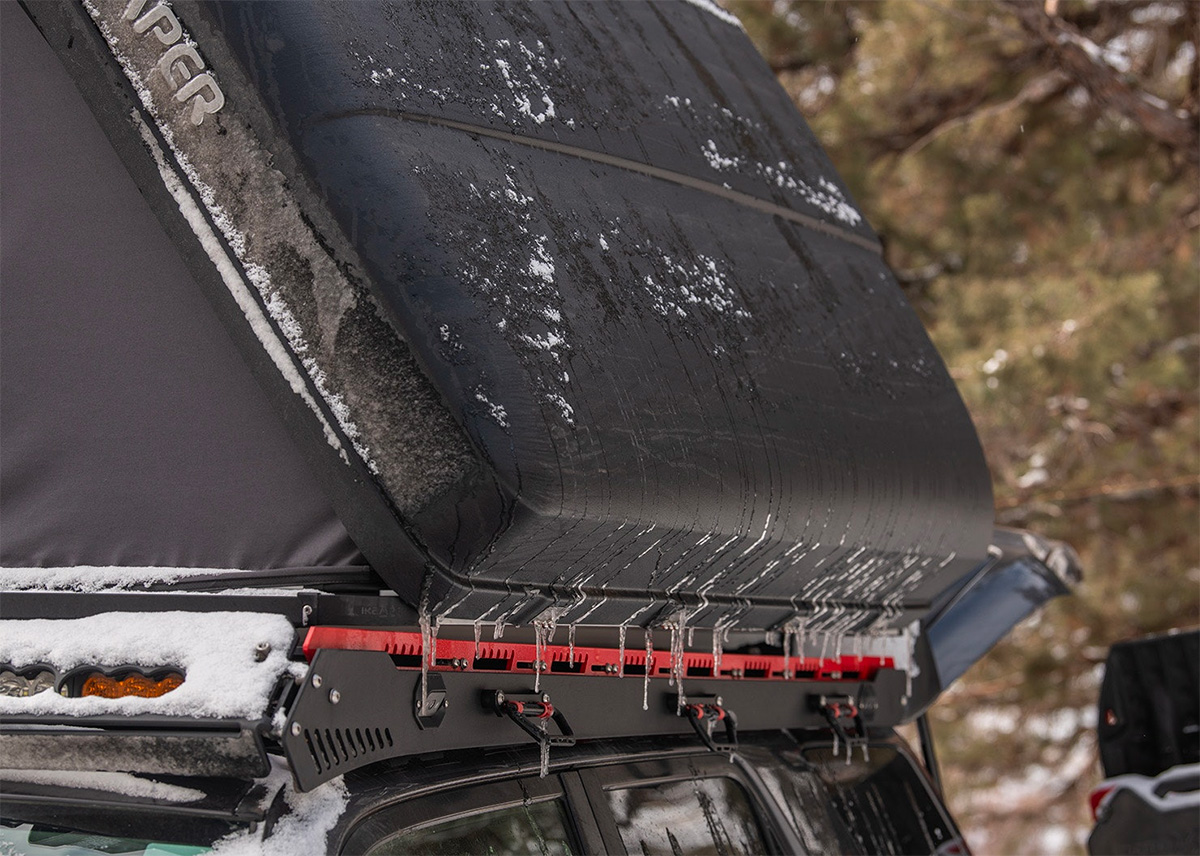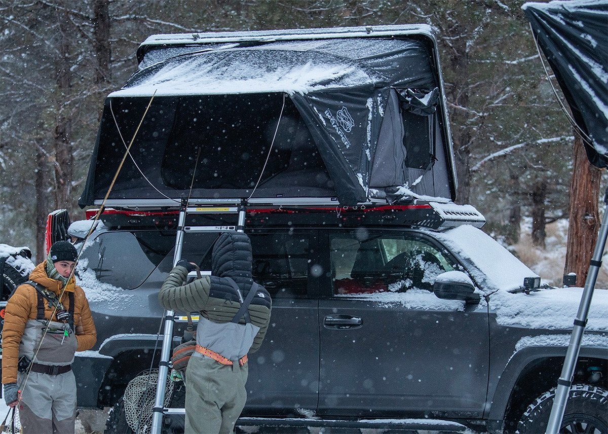 Most tents are made from thin, vinyl-coated polyester that restricts airflow and collects condensation. We decided to build a better roof top tent. The Skycamp® 3.0 is constructed with a breathable, water-resistant poly-cotton canvas. The thicker material, waterproof zippers, and rainfly keep you dry and stay quieter on windy days. Everything a 4-season rooftop tent needs.