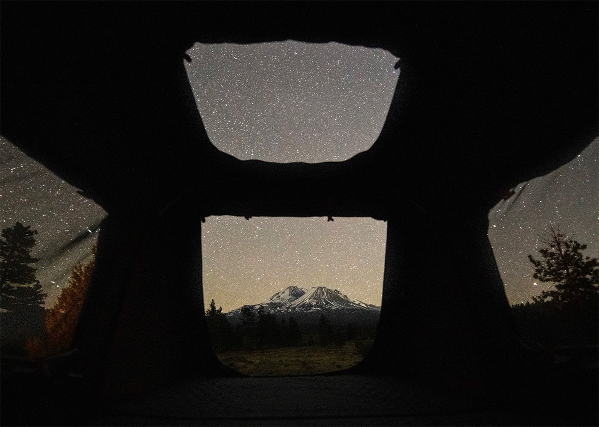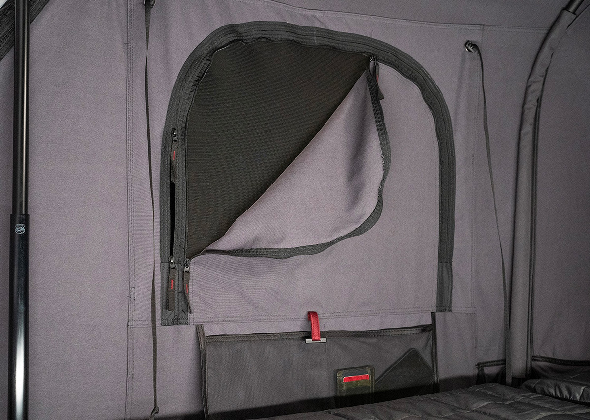 Our Skycamp®'s signature Skyview window offers extra light by day and a view of the stars by night. Each canopy window has three layers: an inner clear vinyl layer, a mesh layer, and an outer canvas layer for versatility in all seasons. They even roll up for extra ventilation. Enjoy the fresh air and a beautiful view from the comfort of your roof top tent.